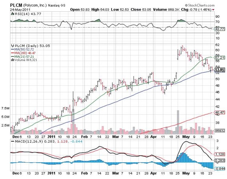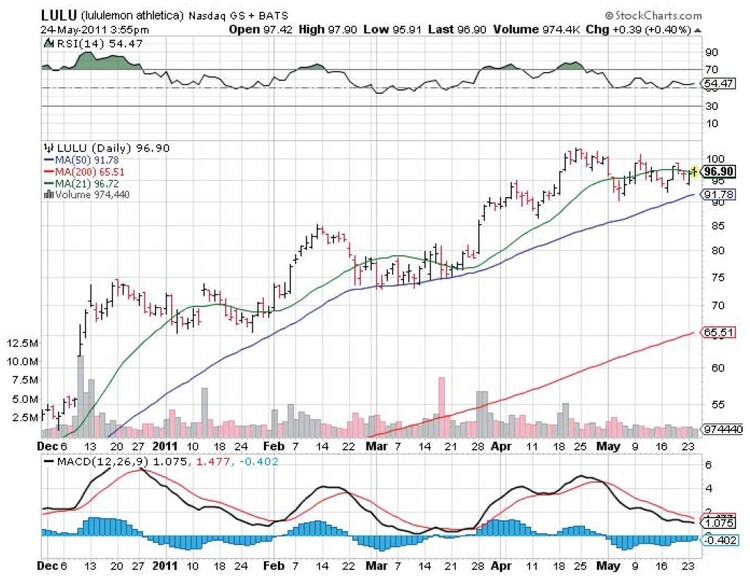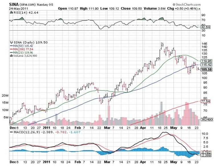 As of late May 2011, the market is in a choppy to slightly downward trend. In such an environment, stocks can change categories quickly, and many categories will have several names listed. For purposes of the examples shown in Figures 1 to 8, I only chose liquid stocks that trade an average of more than a million shares per day.