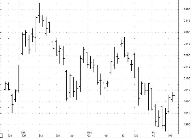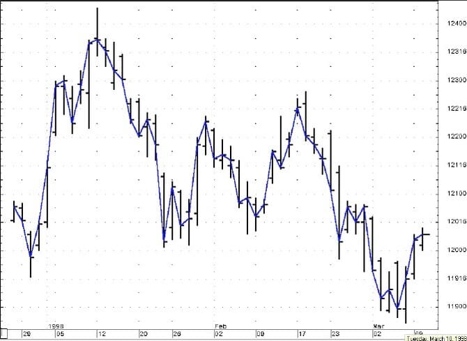 For example, Figure 1 is an open-high-low-close bar chart for the Treasury bond contract. The intraday fluctuations are important, but often the highs and lows represent momentary extremes, whereas the closing price represents the mark-to-market accounting for portfolios and is really the bottom line for the day’s activity. Most daily technical indicators also use the closing price for calculations. In fact, try using your favorite indicators plotted in one window with just the closing price plotted above. Figure 2 is the closing price for the March T-bond contract with a 14-period relative strength index (RSI) plotted below. The normalization step in the RSI calculation creates a range of values between zero and 100, effectively compressing the values, but you can see how close the RSI mimics the closing price. Any indicator that uses the closing price is a filter of the daily bar activity, because the indicator ignores the intraday noise about the trend of the closing prices. The closing price is an important tool, so I use the closing price as the basis for my chart analysis (Figure 3).