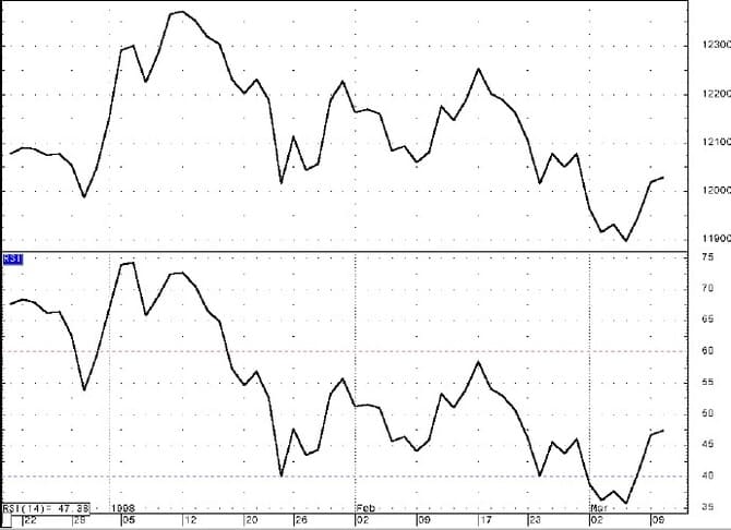 Figure 20 shows the 40-minute bars with the 14-period RSI plotted below the price bars. On March 3, the market hit two key levels of support and rallied, but the RSI did not surpass the 50 level. This was an indication that the momentum was still negative. Then on March 9, after hitting support and reversing, the market began a rally that pushed the RSI above 50 and prices finished the day up, closing past the resistance line of the daily downtrend channel.