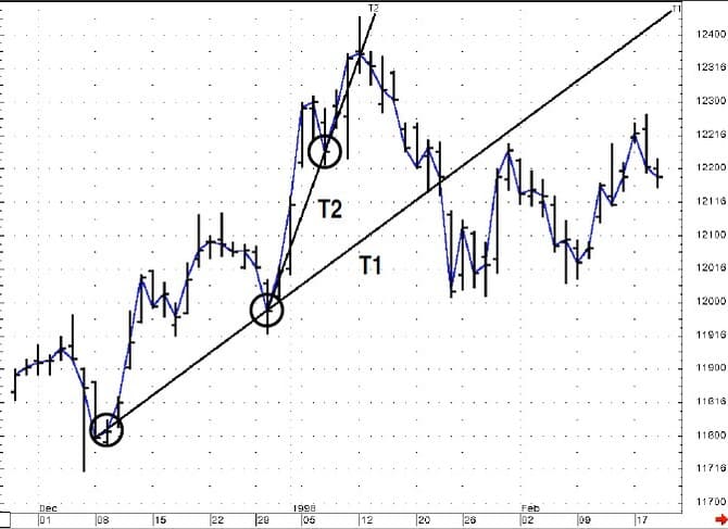 Studying price charts can be likened to surveying the flow of a river. My trendlines are a line of sight from two points along the river’s bank, and as long as that line of sight is not broken, the river’s direction is parallel to that line of sight. Looking at Figure 4, the March 1998 contract, I’ve plotted two trendlines. Trendline 1 (T1) is the closing price of 118-02 on December 9 to the closing price of 119-28 on December 30. I’ve circled each closing price. Trendline 2 (T2) is the closing price of 119-28 on December 30 to the closing price of 122-08 on January 7.
