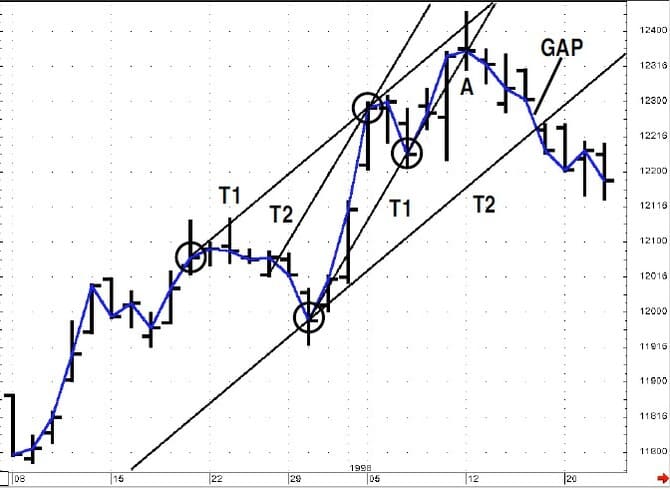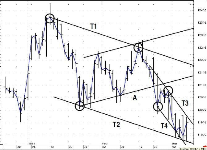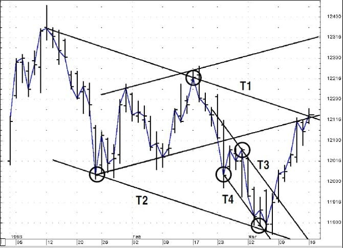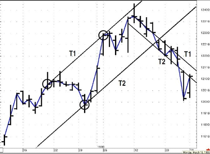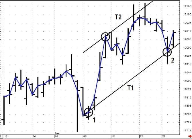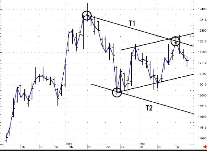 On close observation, the break of T2 seems to forewarn of the test of T1, which was also subsequently broken. This simple approach can offer a degree of confident analysis, but the technique is incomplete because it does not account for the market’s tendency to ebb and flow. Better information may be gleaned by using a technique that recognizes this tendency to trend in one direction and then move counter to the trend. This is where the application of channel analysis can help.