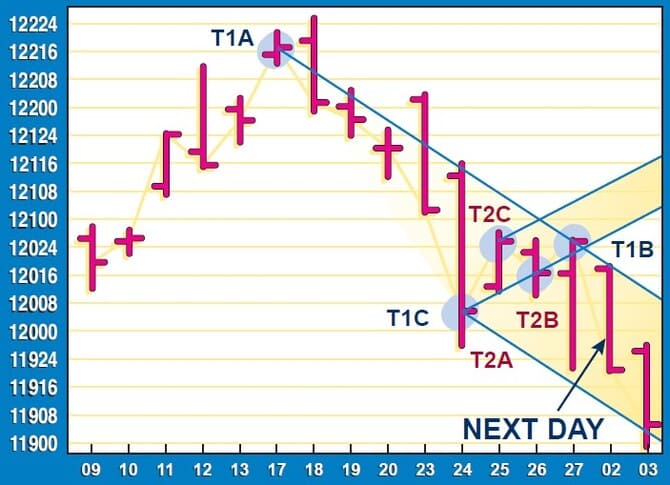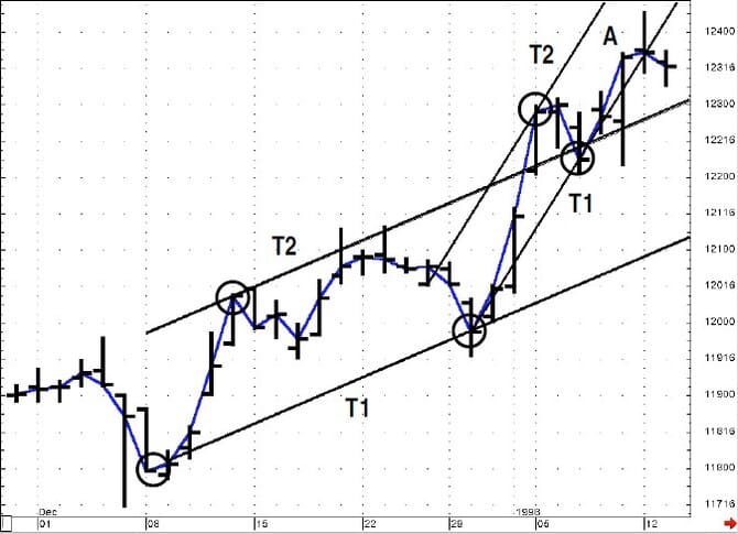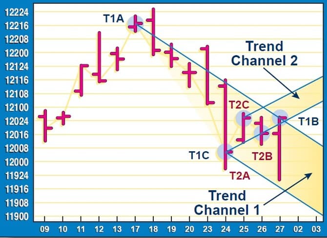Using trend channel analysis provides two valuable pieces of input for trading: the direction of the trend, and future support or resistance levels. There is one problem, however. How could you, if not know, then at least estimate when a new channel should be drawn? For example, looking at Figure 14, on Friday we can draw two different channels — T1A, T1B, T1C and T2A, T2B, T2C. Recall that we are using closing prices; so how can we estimate an upward channel, such as trend channel 2, which would require a higher close the next day to be confirmed, or a downward channel, such as trend channel 1, which would require a downward close the next day?