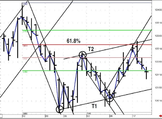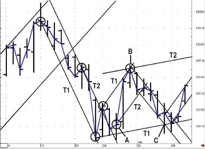 Figure 9 updates with more trading history. On January 28 (point A), the market closed well to the right of the resistance line, which led to a rally (point B), and then the market fell back toward the late January lows (point C). Figure 9 shows the support line drawn along the major low two support points (T1) and a resistance line drawn parallel based on the high point (T2) between the two lows. Figure 10 shows how the market reached this resistance level, exceeded the level and then retreated. In addition, this area was near the Fibonacci 61.8%retracement of the downleg that occurred during January.
