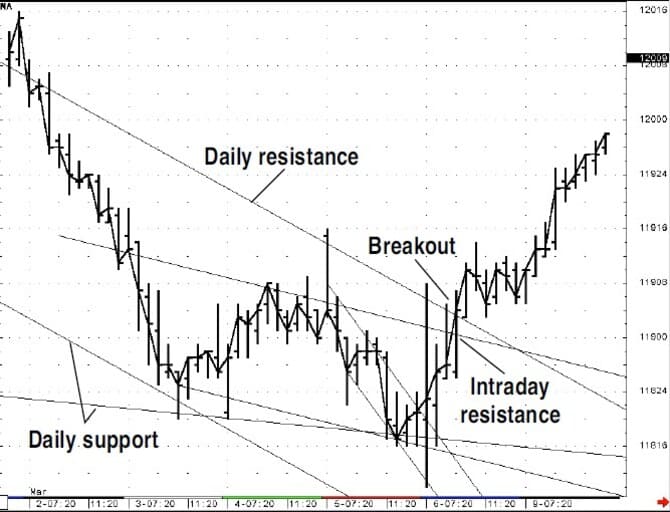 I used 40-minute bars simply for personal preference. You can use any number of minutes per bar you choose; just make sure it divides the daily trading hours into an equal number of intraday bars. At this point, we know that we have trend direction as well as support and resistance levels based on the trend channels from the daily chart. So now the problem turns to the selection of which technical method to employ at appropriate points in time based on the intraday chart analysis.
