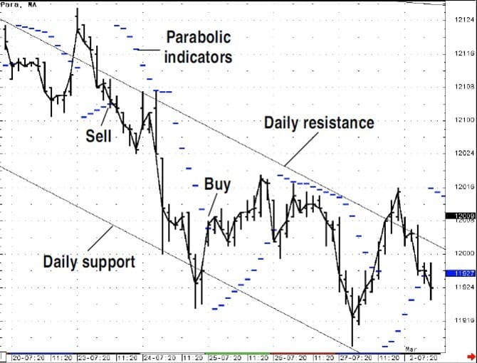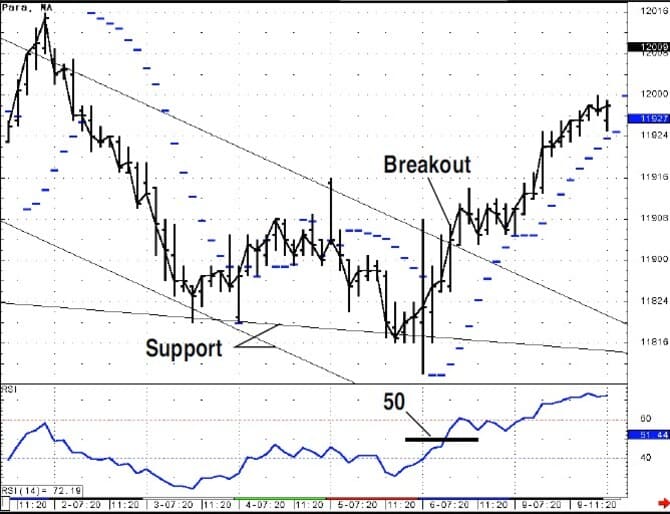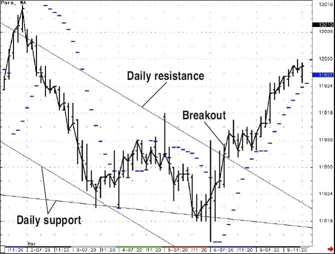 In Figure 18, the downtrend channel is plotted based on the daily bars’ channel. You could use the parabolic by taking signals in the same direction as the trend channel and not reversing. However, if you are at a key support level (Figure 19), then you could take countertrend signals or wait till the downtrend channel is passed to the upside. This approach incorporates the trend, and with the parabolic indicator, the last key support or resistance point is the starting point for its calculation, plus providing you with a trailing-stop mechanism.