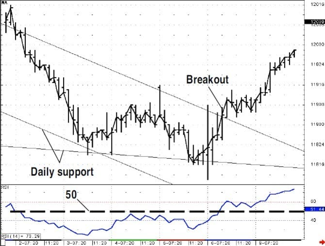 Another possible approach uses momentum. One popular indicator is the relative strength index (RSI). The RSI is best known as an overbought/oversold indicator; high readings indicate an overbought condition and likely reversal, while low readings indicate an oversold condition and a possible bottom in the markets. However, I am of the opinion that the RSI is well-suited to indicating the direction of the market momentum. I set parameters for the 14-bar RSI readings greater than 50 to indicate the trend of momentum is positive, while readings below 50 indicate the trend of momentum is negative. We can apply this analysis in the same fashion. If the market has reached an important support or resistance level, wait for a confimation from the RSI to indicate that the momentum of the intraday trend has changed direction.