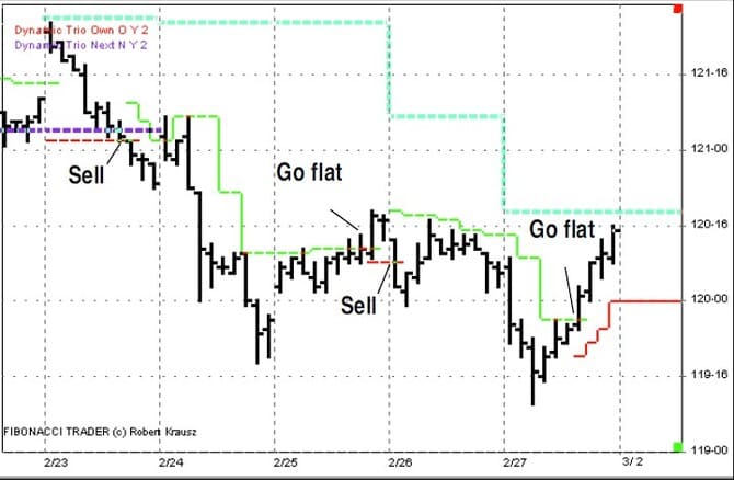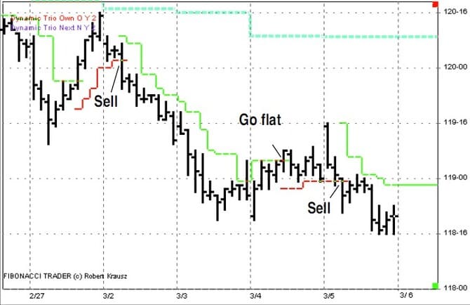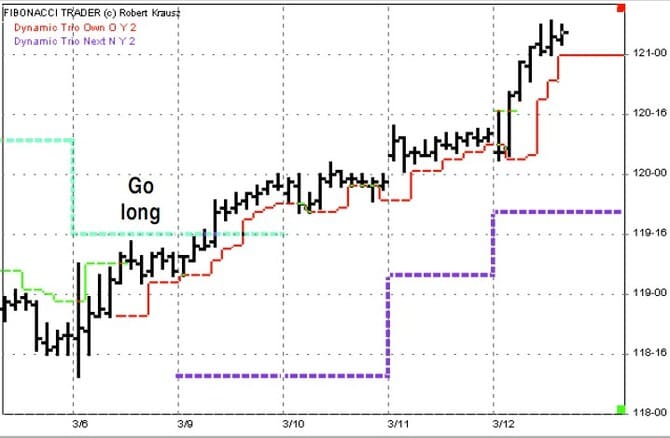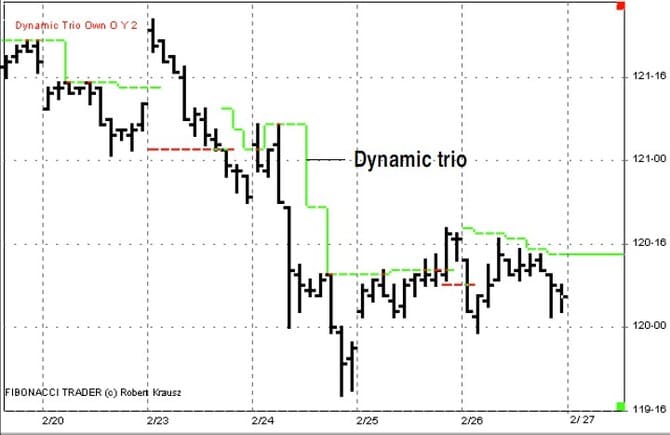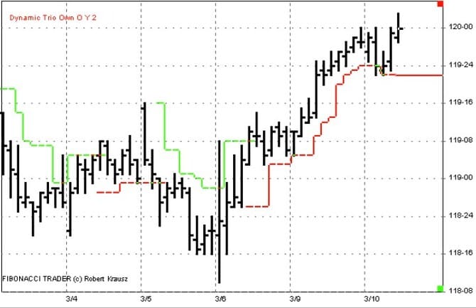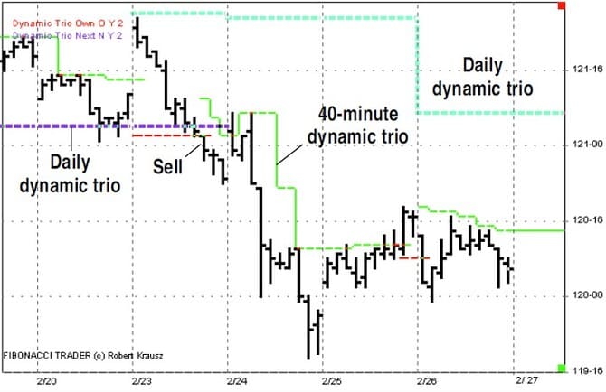 Figure 23 shows the dynamic trio from February 27 through March 4. Here is another good example on how the dynamic trio focuses in on important support and resistance price levels and the direction of the trend. In Figure 24, you can see that after the buy signal on March 6, the dynamic trio indicated important support at the 118-26 level, not back at the low of the move, as indicated in Figure 19 for the parabolic indicator. One feature of the Fibonacci Trader program is the ability to plot indicators from higher time frames. We have been looking at the dynamic trio based on the 40-minute bars. Let’s look at the dynamic trio based on the daily bars shown on the chart of the 40-minute bars as well.