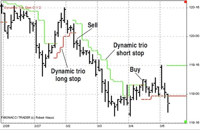 The dynamic trio is part of the technical analysis software designed by trader Robert Krausz. The formula for the indica-tor is proprietary. Normally, this would dissuade me from using the indicator, as I like to know the criteria for calcula-tions, but I’ve followed the performance of this indicator since I wrote the review on it, and I can understand why Krausz has not published the formula. This indicator tracks both the trend and the notable price levels, plus it’s a stop-and-reverse method.