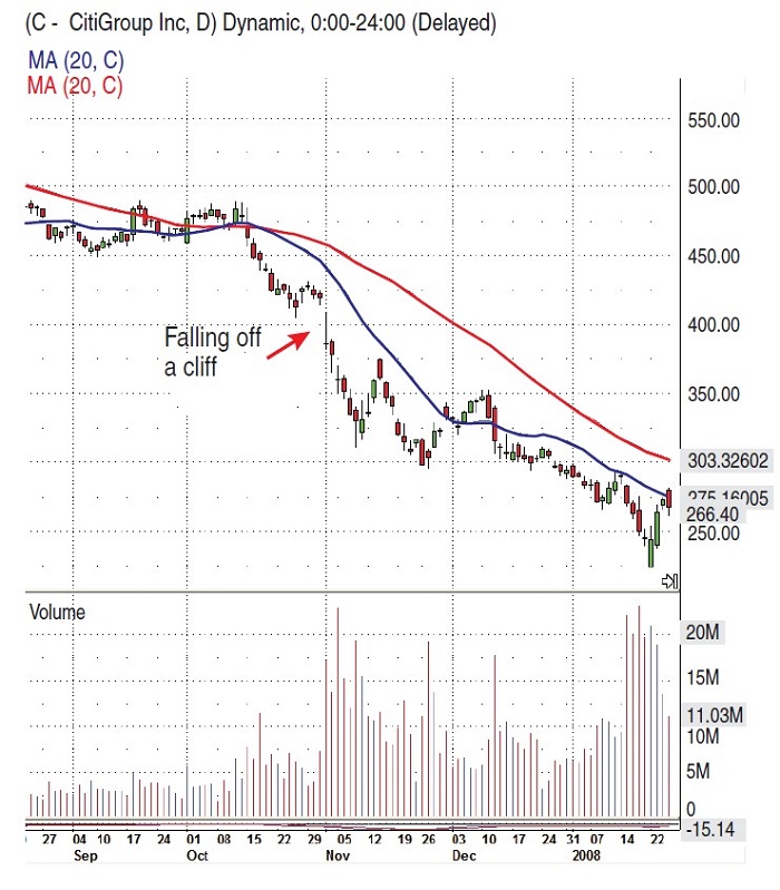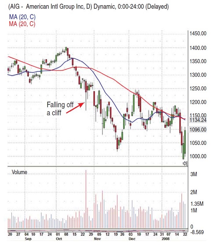 Looking out for the “falling off a cliff” pattern alerts ordinary investors to when professional fund managers and corporate insiders may be dumping a stock at the same time. Although we may not know why a stock is being sold at the time the pattern becomes evident in a chart, it is prudent to get out of the way of a stock falling on heavy volume, and wait until the news about the stock becomes known to the public. Most inexperienced investors will just freeze in their tracks and wait for the news, which may or may not come. The truly disciplined investor will get back in once the stock trades above the 50-day moving average and the average turns up, news or no news.
