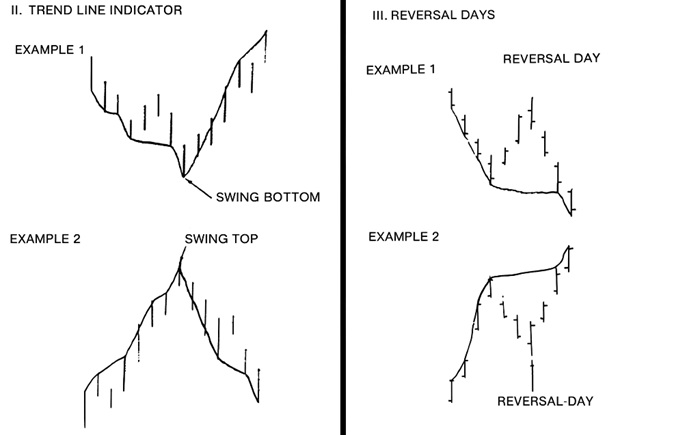 If a market is moving down, the trend line indicator is drawn so as to connect each new low. The trend line indicator does not move up until there has been three days of higher highs. At that point a swing bottom has been formed. A swing top is formed when the market has been advancing and then makes lower lows for three days. The only exception to this rule occurs when the third day happens to be a reversal day. Since a reversal day augers strongly for a change in trend we must wait to see the action of the fourth day before confirming that a swing top or swing bottom has occurred. Refer to reversal days, examples 1 and 2.