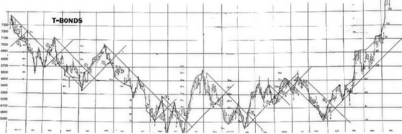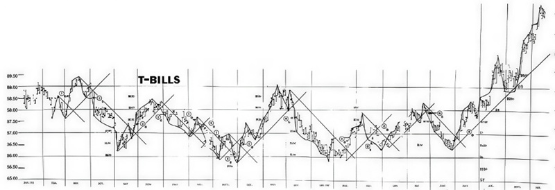 Now, if you will refer to the chart on T-bonds The basic rules of this system are to go short on a close below the 1×1 from a previous swing bottom. This occurred on January 22 (Trade No. 1). Now we draw a 1×1 down from the swing top. We stay short until we get a close significantly breaking this 1×1. You can see that occurred about March 12 (Trade No. 2) and we were forced to buy. At this time, we drew in our 1×1 from the previous swing bottom. Unfortunately we were whipsawed here and forced to sell again on March 23, (Trade No.3) incurring a loss. We stayed with this trade until May 18 when we took a profit and reversed to the long side (Trade No. 4).