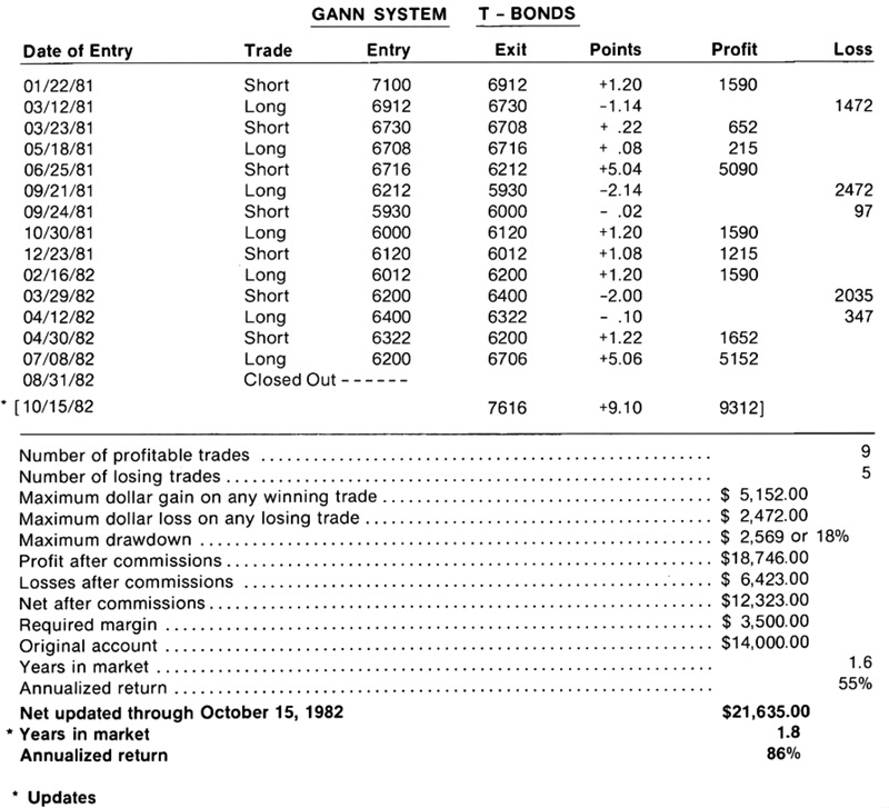 The required margin for T-bonds at the time was $3,500. However, to trade 1 contract, we believe you should have $4 in your account for every $1 margined, or in this case, $14,000. This is mandatory so that you can withstand heavy drawdowns during choppy periods. The system was in the market 1.6 years and, based on a $14,000 account, showed an annualized return after commissions of 55%.