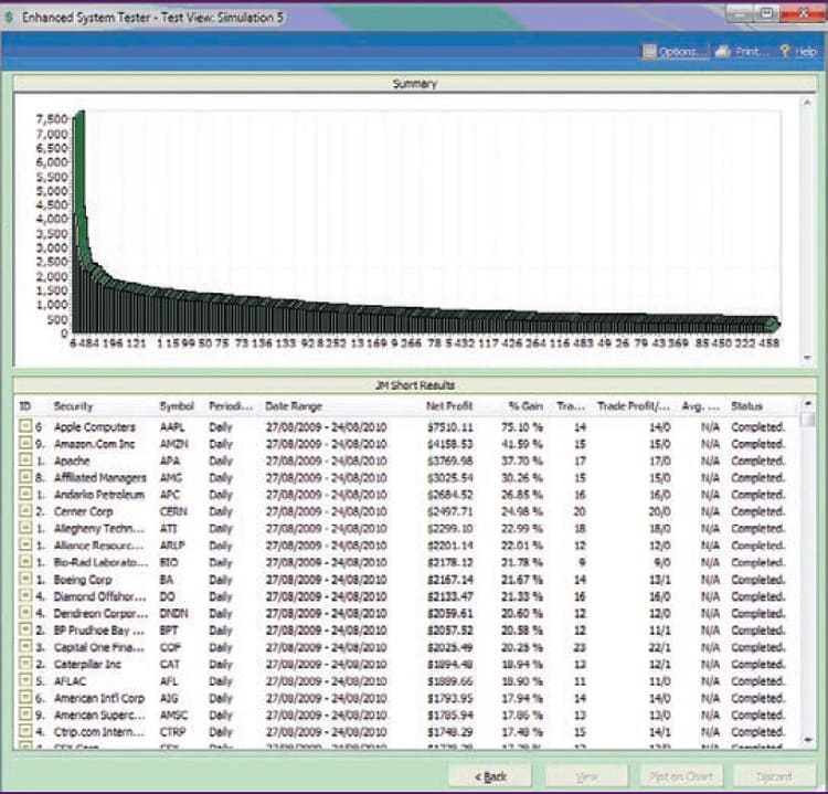 For short signals (Figure 6) there was not one negative result, with Apple Inc. (AAPL) remarkably giving a 75.10% return. (Apple a profitable short? We forget that since June 21, 2010, till the end of the test period — that is, August 24, 2010 — AAPL shares have fallen from $279.01 to $242.01.) The MetaStock formulas for the Enhanced System Tester are shown in the sidebar, “MetaStock Formulas For Enhanced System Tester.