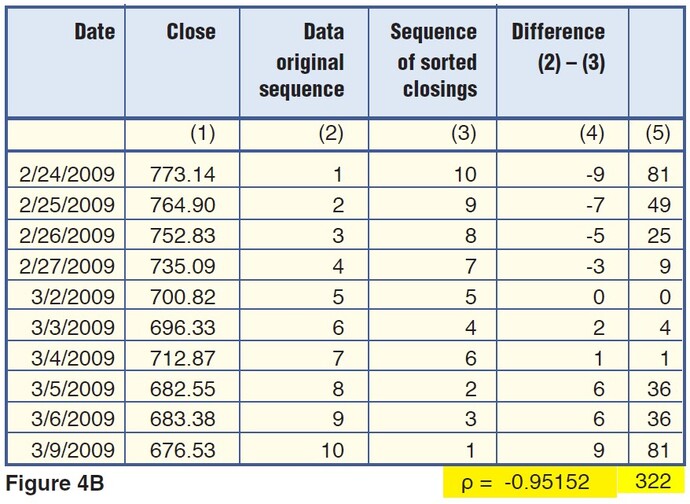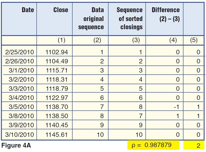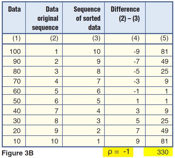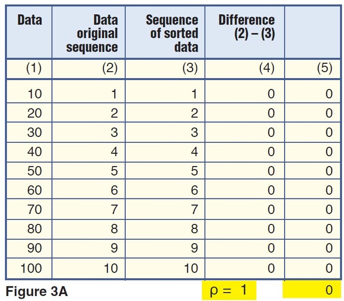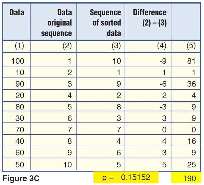 The key to these observations and the main idea behind the Spearman indicator lies in column 3, “Sequence of sorted data.” It contains ranks 1–10 for the 10 original elements, starting from lowest to highest. The lowest element (10) has the lowest ranking (1), while the highest element (100) has the highest ranking (10). Column 4 is the difference between ranks in columns 2 and 3 for the same element in column 1. The last column calculates elements in column 4 raised to the power of 2.
