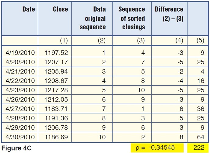 The tables in Figure 4 contain three 10-day interval extracts from recent Standard & Poor’s 500 daily data: one with a strong uptrend, a second in a strong downtrend, and a third containing no trend. Each table has a computed Spearman coefficient as described in formula (1). What do we observe in these tables? First, the strong uptrend in Figure 4A has a Spearman coefficient equal to 0.987879, which confirms the strong positive correlation between the original ranks of the closing prices (column 2) and the rankings after sorting prices in descending order (column 3). The Spearman coefficient computed for data in Figure 4B is -0.95152, confirming a strong negative correlation between ranks and consequently, a strong downtrend. Finally, for the sequence in Figure 4C, the Spearman coefficient is -0.34545, which shows a weaker negative correlation between the ranks. In other words, it suggests the lack of a clear trend.