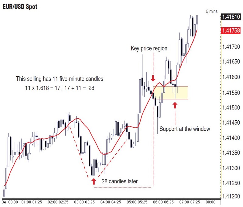 This is precisely what happens when you apply the golden ratio and find key days on the daily charts or key hours on the shorter time frame (Figure 5). Each signal is a signal in its own right because it is the result of previous buying and selling — that is, the readjustment of the market — and should only be used once, though the high or low from these key price regions may continue to be support or resistance for much longer. Chances are there will be another event where the number can be applied.