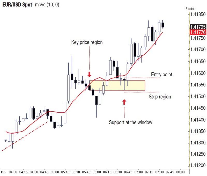 Entry strategy: The window in Figure 8 shows how the market finds support. At this point, you can determine a buy level at the top of the hammer-type candlestick that has confirmed support at the base of the window.