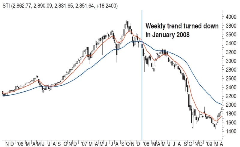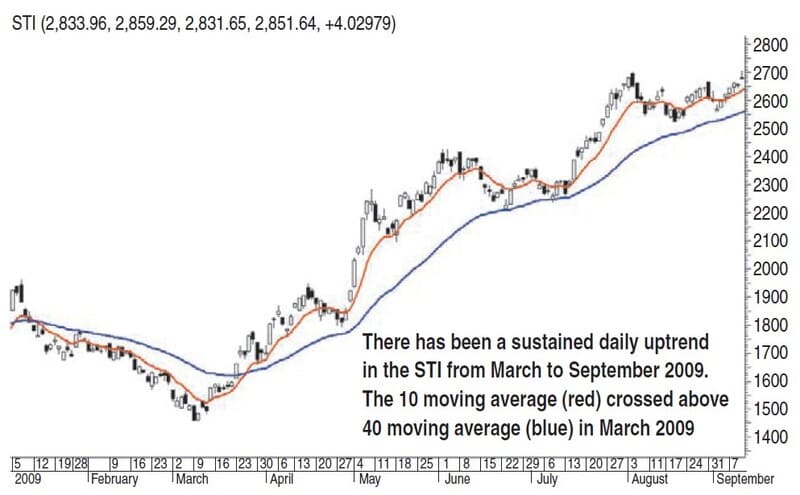 - FIGURE 1: WEEKLY CHART OF STRAITS TIMES INDEX (STI) FROM MARCH 2006 TO MARCH 2009. After a bullish rally in 2007, the weekly chart displayed a reversal in trend in 2009 when the 10-period EMA crossed below the 40-period EMA.