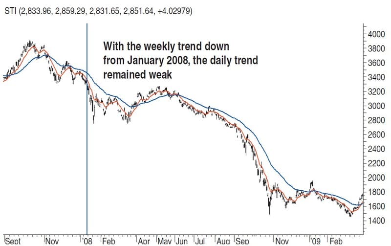 - FIGURE 5: CAN THE SMALLER TIME FRAME INFLUENCE A LARGER TIME FRAME? On this daily chart of the STI, you can see a sustained uptrend from March to September 2009.