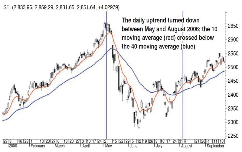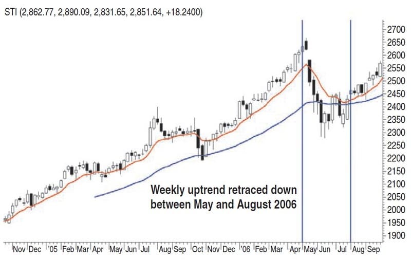 - FIGURE 3: CONFLICTING TREND DIRECTIONS. On this weekly chart of the STI, you see a retracement of the uptrend from May to August 2006. Although the main trend is still up, this will display a downtrend in the daily chart.