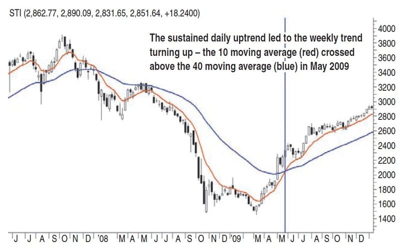 3. The third time-frame issue is whether a smaller time frame can influence a larger one. This is a valid question because given the first time-frame relationship, it is the larger time frame that drives the smaller one. How does the smaller time frame influence the larger? How can a daily downtrend turn the weekly trend up? It is possible only when there is a sustained change in the trend of the smaller time frame. In Figure 5, the sustained uptrend in the daily chart of the STI from March 2009 eventually led to the uptrend in the weekly trend in May 2009, when the 10 EMA crossed above the 40 EMA (Figure 6).